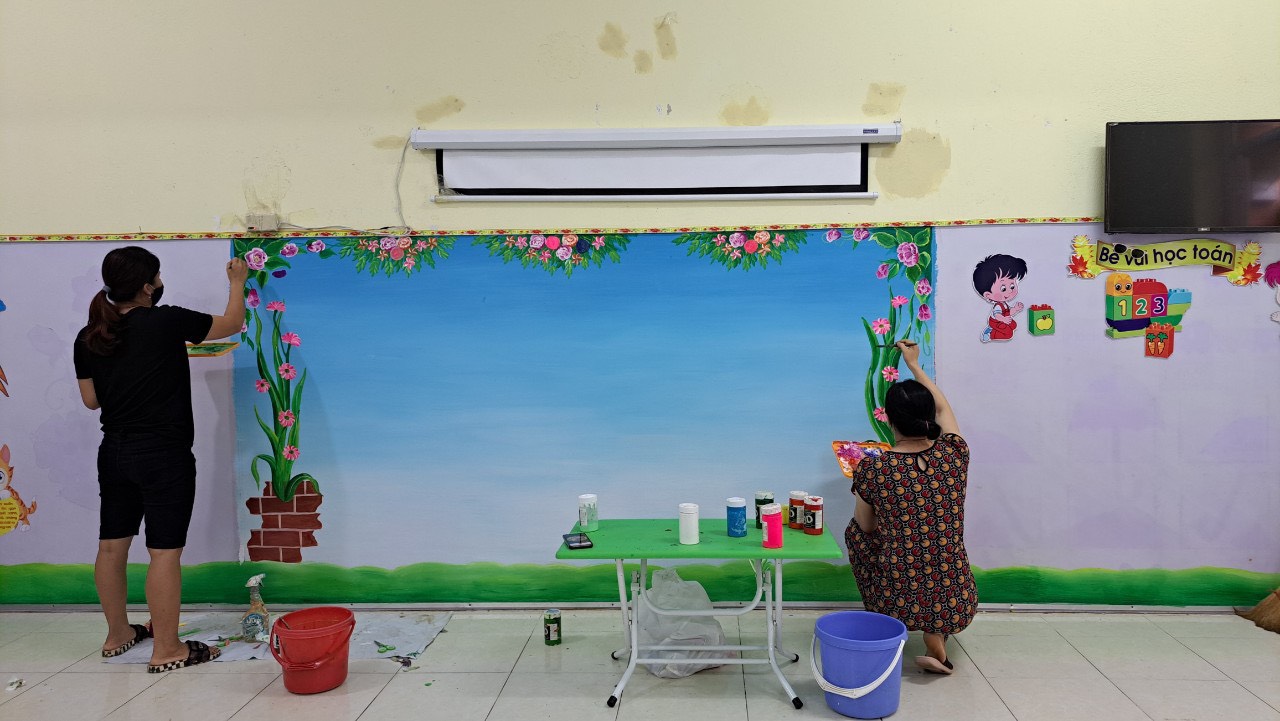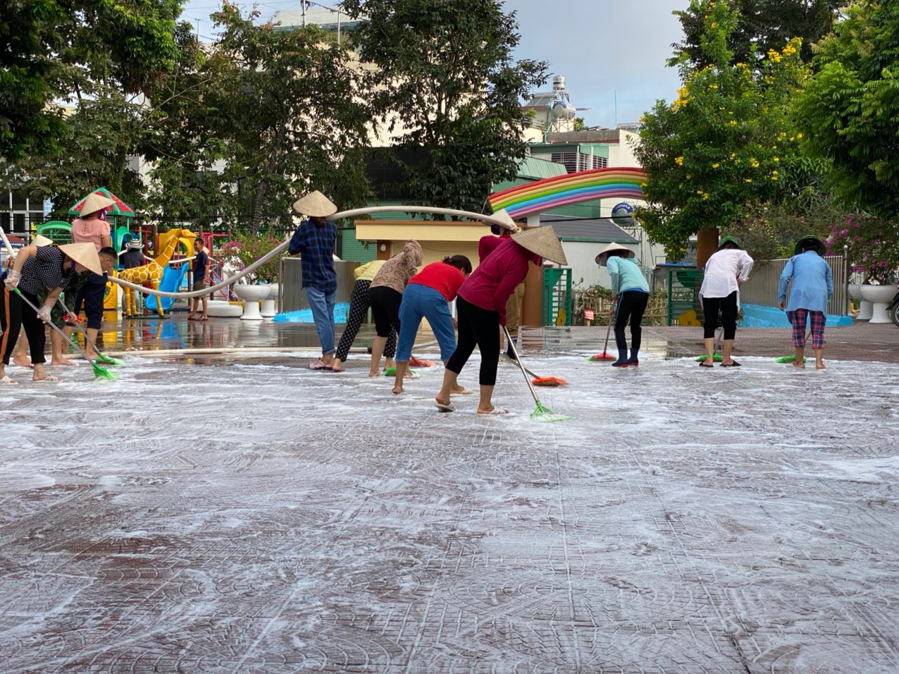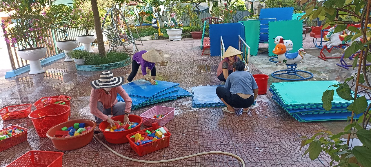 100%  cán bộ quản lý, giáo viên, nhân viên trong nhà trường đã tham gia tổng vệ sinh toàn bộ khuôn viên trường học; sơn sửa đồ chơi ngoài trời, vệ sinh cắt tỉa, chăm sóc cây cảnh trong khuôn viên trường; lau chùi, khử khuẩn các lớp học, phòng làm việc, bàn ghế, cầu thang, đồ chơi,...bằng xà phòng và dung dịch khử khuẩn; phát quang bụi rậm, khơi thông cống rãnh, gom rác thải trong và ngoài khuôn viên trường phòng bệnh Covid-19. Các tổ chuyên môn tư vấn, hướng dẫn giáo viên tiến hành trang trí nhóm/lớp theo hướng đổi mới, tạo cơ hội cho trẻ được tham gia trải nghiệm theo quan điểm “Xây dựng môi trường giáo dục lấy trẻ làm trung tâm”.