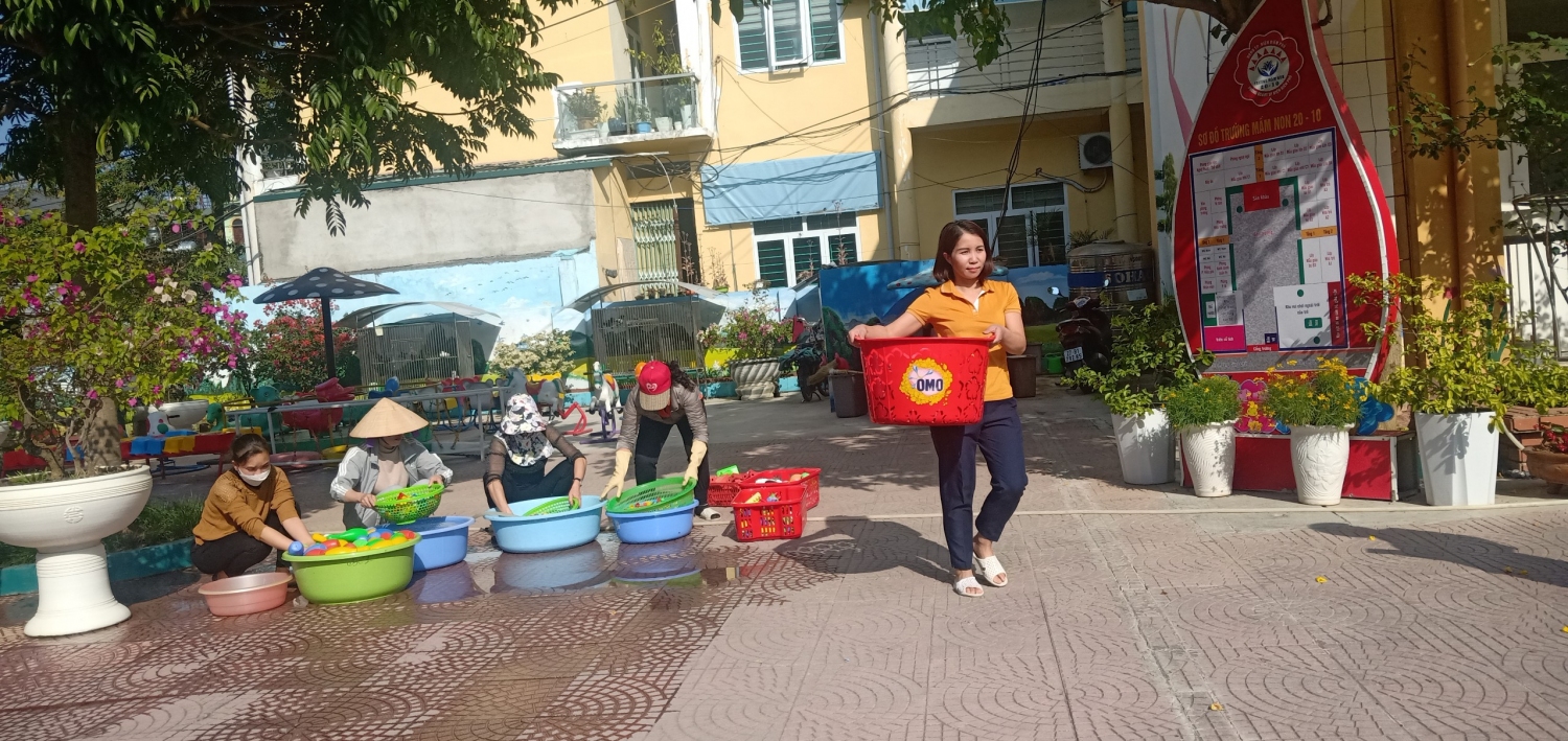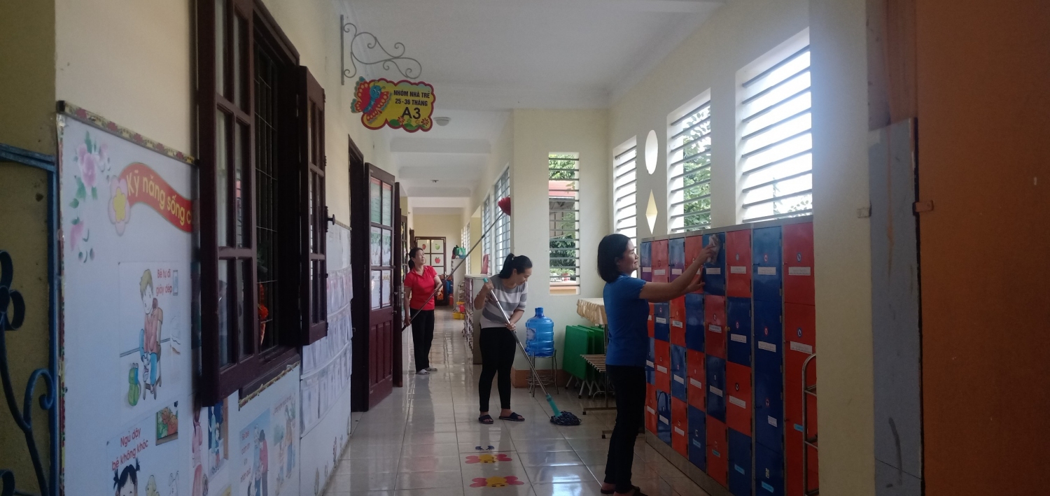 Nhà trường đã tổ chức tổng vệ sinh môi trường trong lớp, ngoài trời, lau rửa đồ chơi, lau cầu thang, quét trần nhà (nhằm chống thấm dột), vệ sinh nhà bếp, các phòng chức năng, các phòng làm việc đảm bảo sạch, đẹp, phòng chống dịch bệnh. Trước khi nghỉ tết các nhóm lớp đã tiến hành bàn giao tài sản cho đồng chí bảo vệ nhằm đảm bảo tốt công tác phòng chống cháy nổ, đảm bảo an toàn về cơ sở vật chất, không để xảy ra tình trạng mất mát trong thời gian nghỉ tết Nguyên Đán.