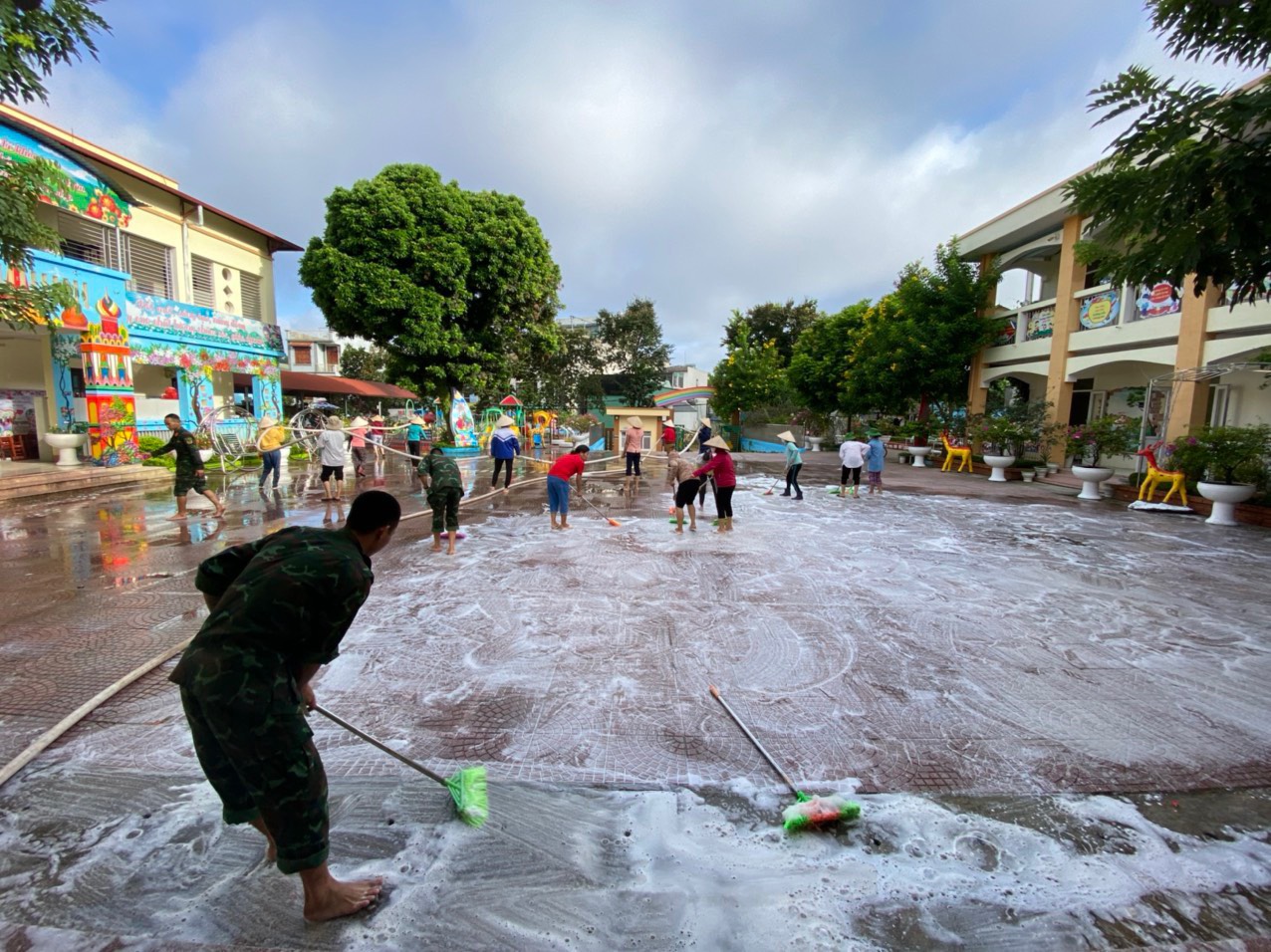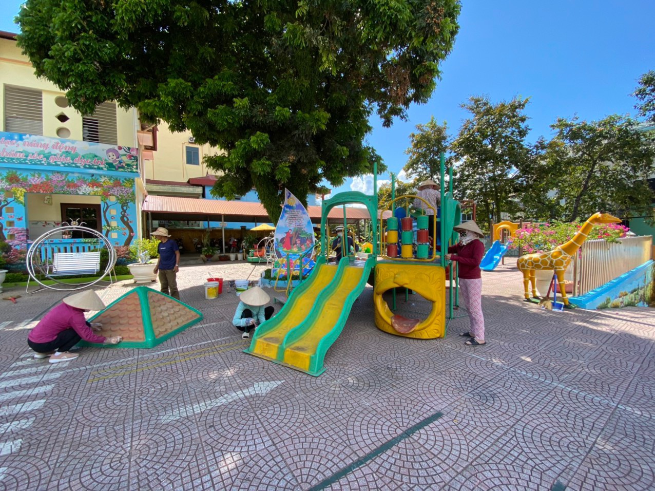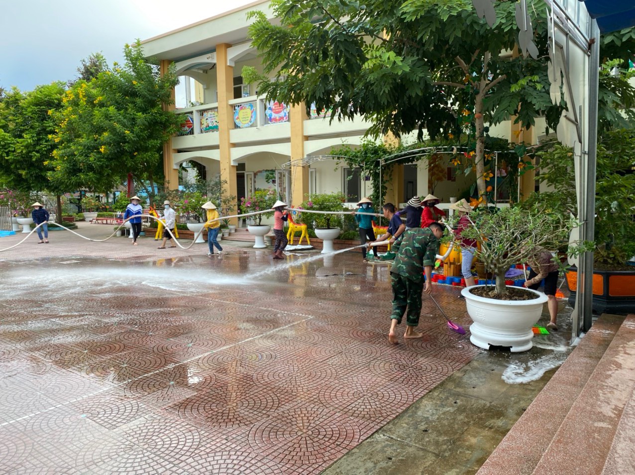 100%  cán bộ quản lý, giáo viên, nhân viên trong nhà trường đã tham gia tổng vệ sinh toàn bộ khuôn viên trường học; sơn sửa đồ chơi ngoài trời, vệ sinh cắt tỉa, chăm sóc cây cảnh trong khuôn viên trường; lau chùi, khử khuẩn các lớp học, phòng làm việc, bàn ghế, cầu thang, đồ chơi,...bằng xà phòng và dung dịch khử khuẩn; phát quang bụi rậm, khơi thông cống rãnh, gom rác thải trong và ngoài khuôn viên trường phòng bệnh Covid-19. Các tổ chuyên môn tư vấn, hướng dẫn giáo viên tiến hành trang trí nhóm/lớp theo hướng đổi mới, tạo cơ hội cho trẻ được tham gia trải nghiệm theo quan điểm “Xây dựng môi trường giáo dục lấy trẻ làm trung tâm”.