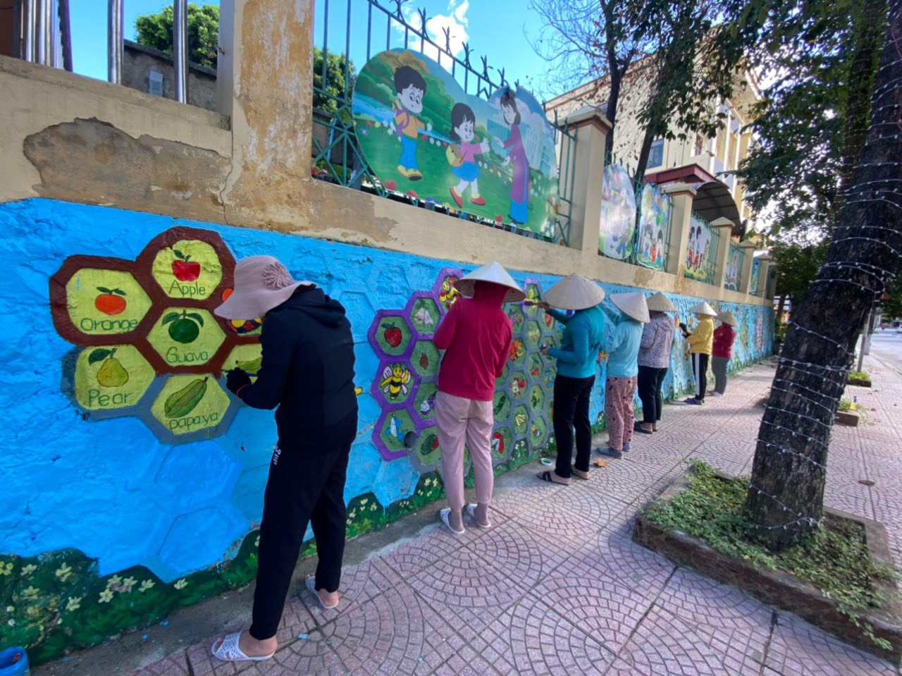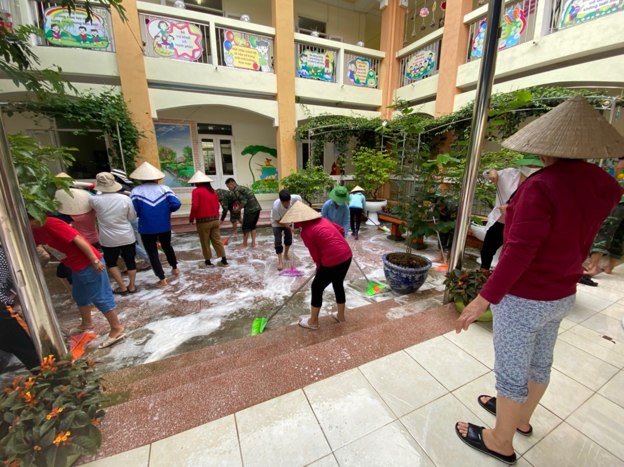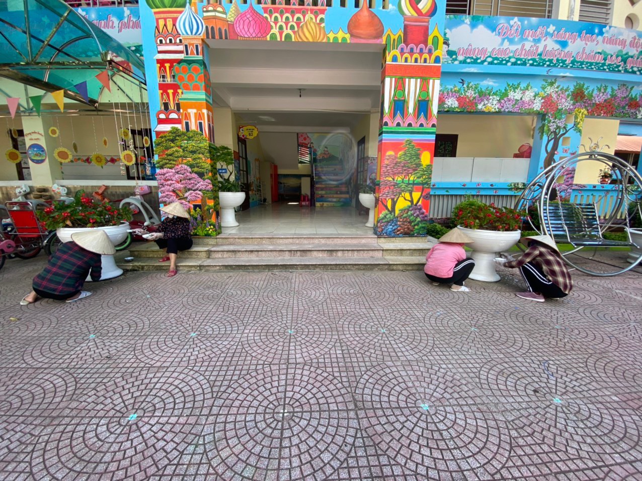 100%  cán bộ quản lý, giáo viên, nhân viên trong nhà trường đã tham gia tổng vệ sinh toàn bộ khuôn viên trường học; sơn sửa đồ chơi ngoài trời, vệ sinh cắt tỉa, chăm sóc cây cảnh trong khuôn viên trường; lau chùi, khử khuẩn các lớp học, phòng làm việc, bàn ghế, cầu thang, đồ chơi,...bằng xà phòng và dung dịch khử khuẩn; phát quang bụi rậm, khơi thông cống rãnh, gom rác thải trong và ngoài khuôn viên trường phòng bệnh Covid-19. Các tổ chuyên môn tư vấn, hướng dẫn giáo viên tiến hành trang trí nhóm/lớp theo hướng đổi mới, tạo cơ hội cho trẻ được tham gia trải nghiệm theo quan điểm “Xây dựng môi trường giáo dục lấy trẻ làm trung tâm”.