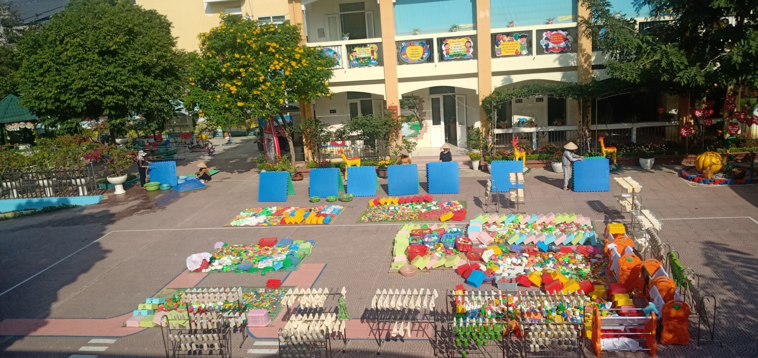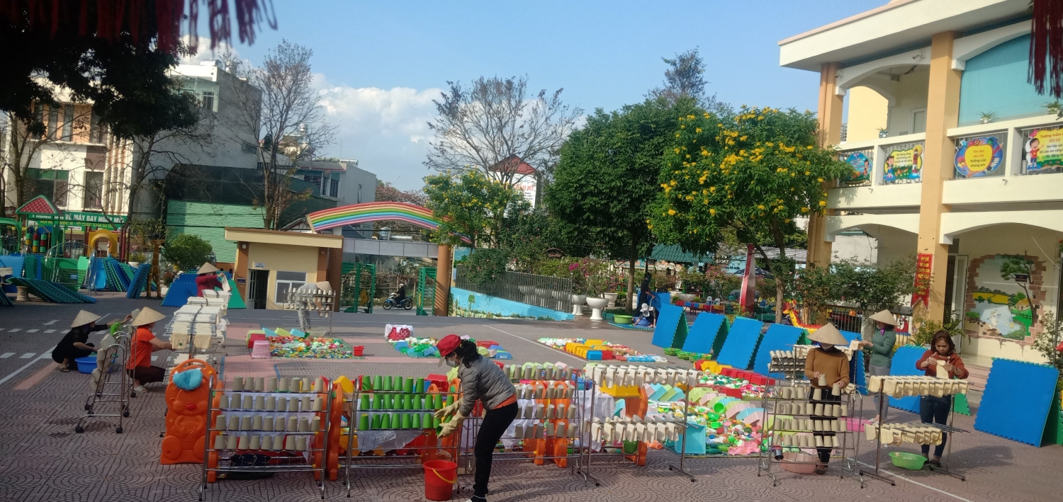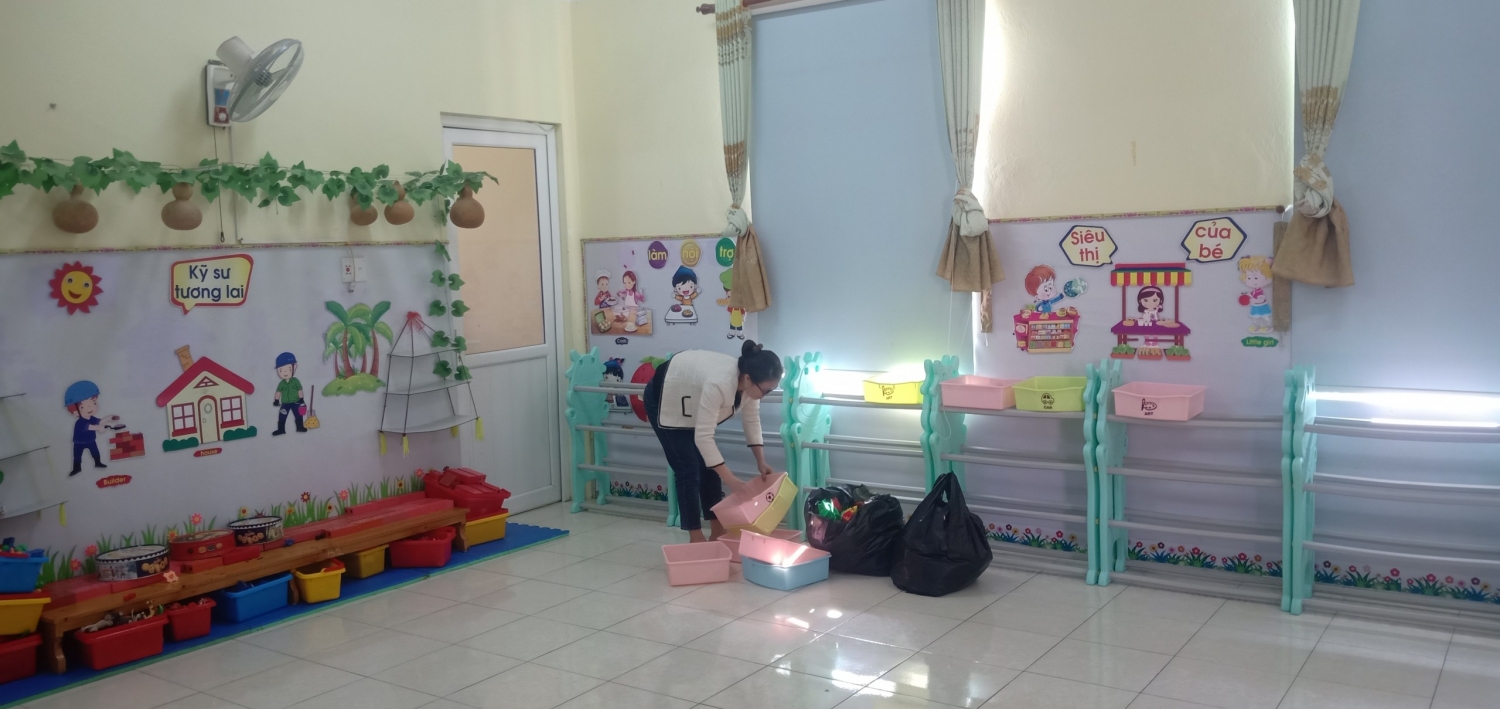 Nhà trường đã tổ chức tổng vệ sinh môi trường trong lớp, ngoài trời, lau rửa đồ chơi, lau cầu thang, quét trần nhà (nhằm chống thấm dột), vệ sinh nhà bếp, các phòng chức năng, các phòng làm việc đảm bảo sạch, đẹp, phòng chống dịch bệnh. Trước khi nghỉ tết các nhóm lớp đã tiến hành bàn giao tài sản cho đồng chí bảo vệ nhằm đảm bảo tốt công tác phòng chống cháy nổ, đảm bảo an toàn về cơ sở vật chất, không để xảy ra tình trạng mất mát trong thời gian nghỉ tết Nguyên Đán.